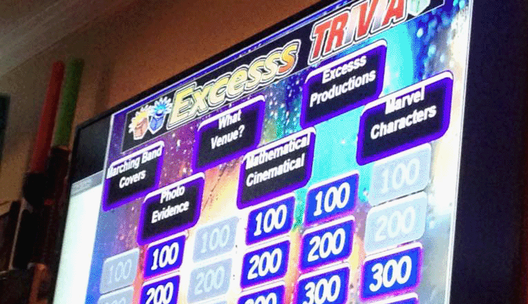 Excesss Trivia's game-show style trivia nights can provide fun excitement to any bar night, happy hour or special event. We provide a Jeopardy-like game screen, either on your TV or with our projectors, and up to ten teams or individual players can use our ring-in wireless buzzers to play in real-time. We also can host remote trivia online for virtual events or corporate team building/meetings, as well as phone-based trivia, music bingo, and even the classic pub-style triva, as well!