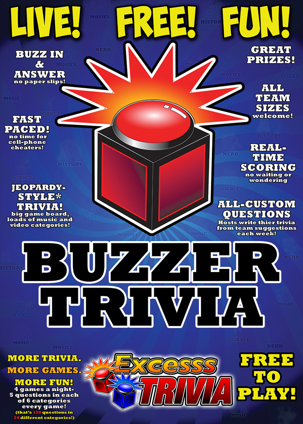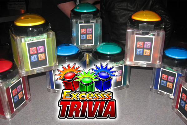 Excesss Trivia provides TV-style buzzer ring-in trivia nights, with full multimedia questions! Pictures, movie clips, sounds, and music are all part of the fun when Excesss Trivia comes to your bar or special event!